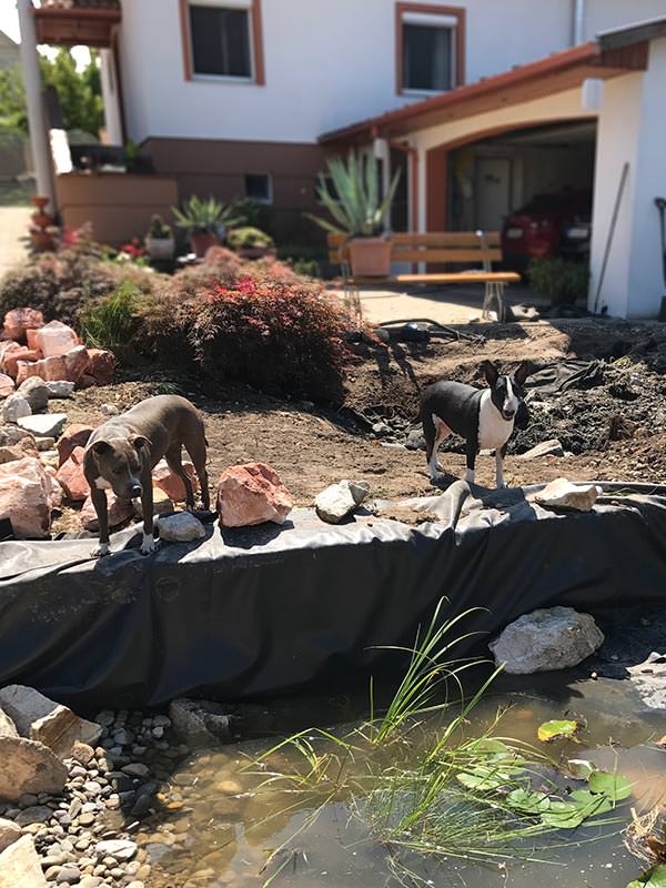 Minden sziklakert és tó kialakításánál figyelembe kell vennem, hogy a gyermek vagy házi kedvenc ott fog szaladgálni a sziklákon. Ezért minden sziklát úgy szoktam elhelyezni, hogy arra bármikor rá lehessen lépni. Én is tesztelem a magam 105 kilójával, de én csalok, mert figyelem azt is hova lépek.