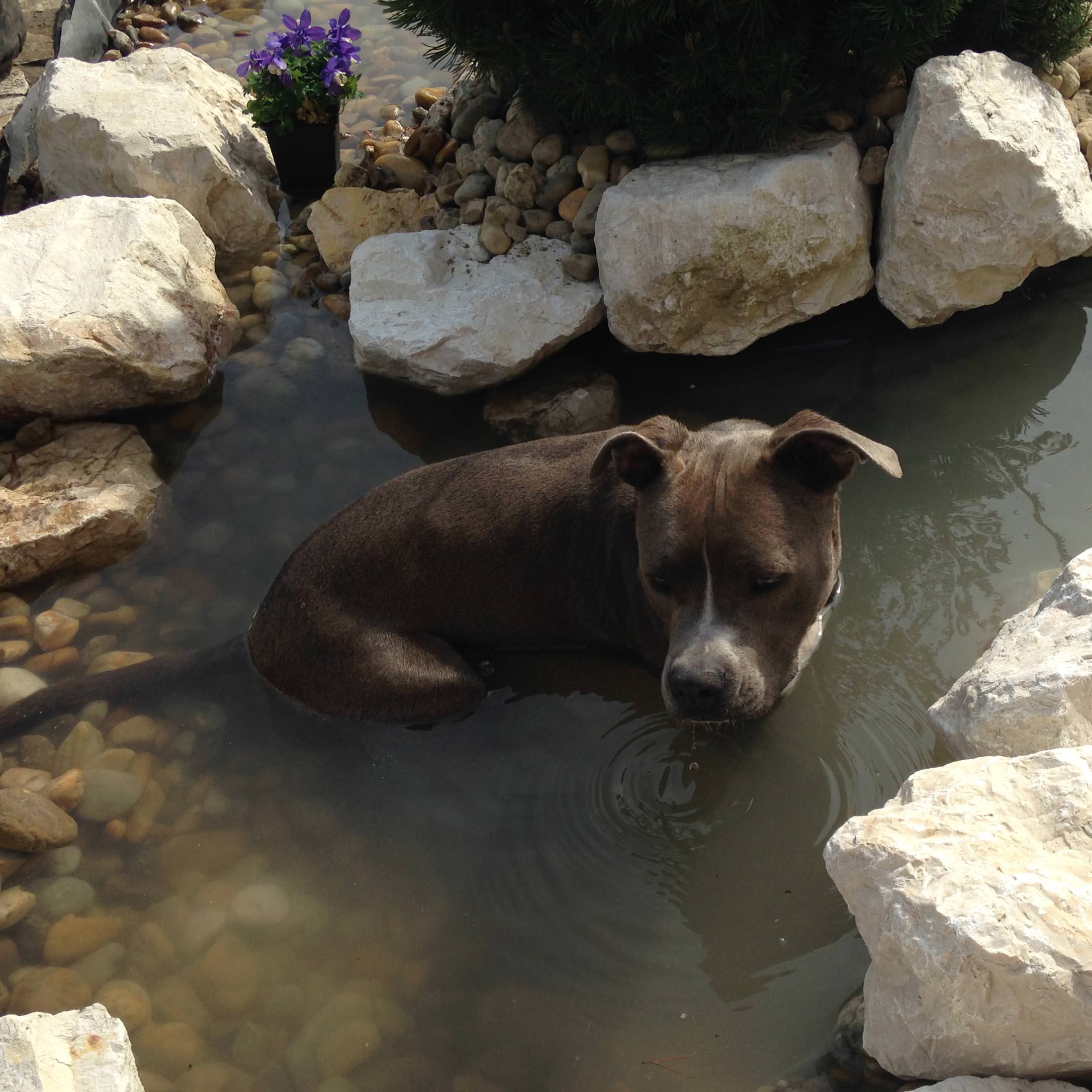 Fajtája: Staffordshire terrier. 24 kg. Egy igazi örökmozgó. Az ásás, a sziklamászás és a tóban fürdés mestere. Amire lehet, felugrik,ha esetleg van egy kóbor lyuk a kerítésen, egyből átnéz a szomszédba.